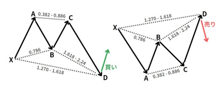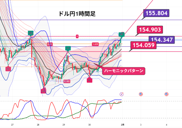 1時間足は戻しの形が整い、チャート上では ハーモニックパターンも示唆されています。