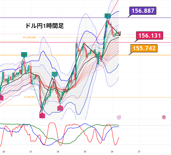 結論はシンプルで、上は156.887、下は156.131(割れたら155.742)。ここだけを軸に戦います。