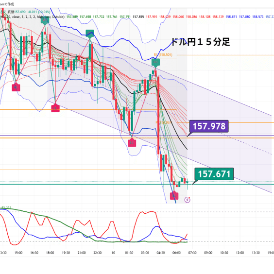 今の15分足は、157.67を挟んだ戻りの強弱を見るのがわかりやすいです。