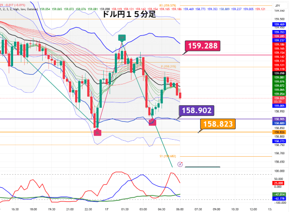 1時間足・15分足ともに、159.28は戻り売りの判断に使いやすいラインです。