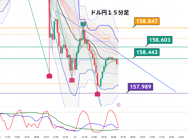 158.44〜158.60付近まで戻したあとに失速し、15分足で上ヒゲ陰線や戻り高値失敗が出るパターン。