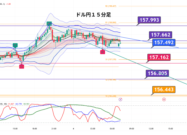 1時間足・15分足では、157円台後半で上値を抑えられ、短期的にはむしろ高値切り下げの形が見えています。