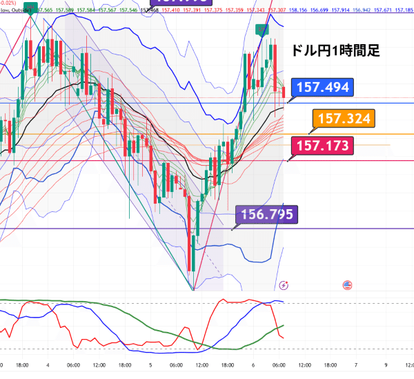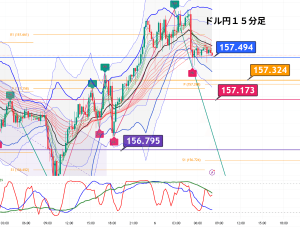 今日のキモは、157.494を上抜けて定着できるか、それとも157.324〜157.173に押し戻されるかです。
