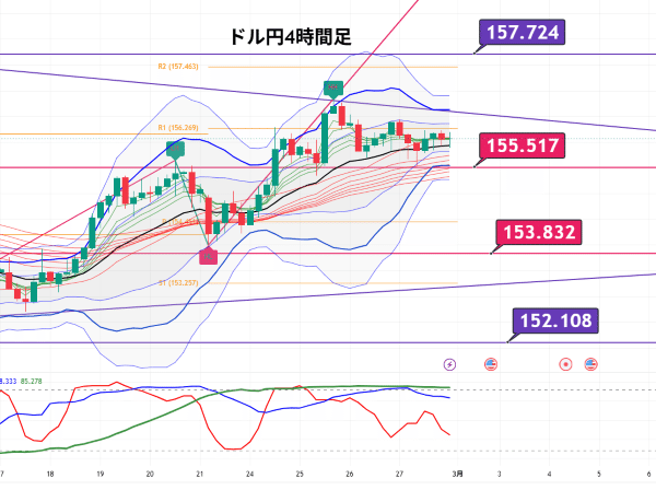 つまり、155.50を上で維持できるなら上目線、割れてくると一気に慎重という見方になります。